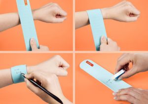 腕に巻いて使用できるメモ「ウェアラブルメモ」は、いつでもどこでもメモができる商品です。
