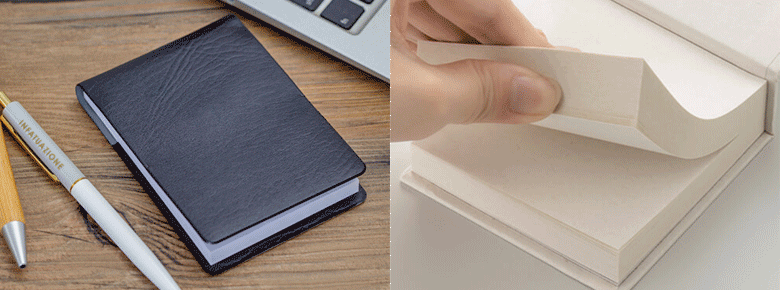コンパクトなサイズのメモ帳。糊で綴じたタイプ、リング閉じタイプ、メモ用紙がバラバラで箱に入ったタイプなど、さまざまな種類のメモ帳が揃っています。ちょっとしたメモはやっぱり紙がいい!という根強い意見も多いので、ノベルティとしても依然大定番なアイテムです。レザー調のカバー付きのものは記念品として大人気!
