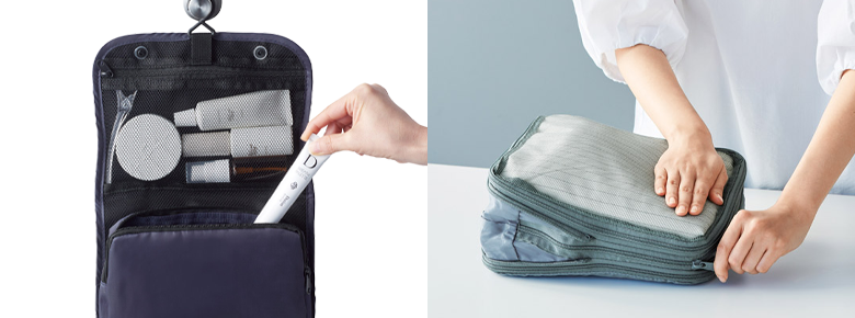 旅行・出張・遠征など旅先で使うのに特化した機能的なトラベルポーチ/トラベルバッグ。限られたスペースを有効活用できるように圧縮できたり、ポケットがたくさんあったり、吊り下げて使えるようになっていたり、自立したりと、持ち運びにも使用にも便利な機能が盛りだくさんです。