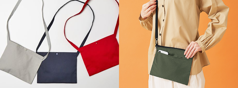 サコッシュとは基本的にはマチのない薄型のフラットなショルダーバッグ。スマホやお財布など最低限の荷物を入れるのにちょうどいいサイズです。両手を空けてアクティブに活動できるので、イベント系ノベルティやスポーツ系ノベルティで人気です。1ポケットのシンプルなタイプから複数ポケットがあったりファスナーやボタンが付いたタイプ、素材もキャンバスから撥水タイプまでさまざまなサコッシュがあります。