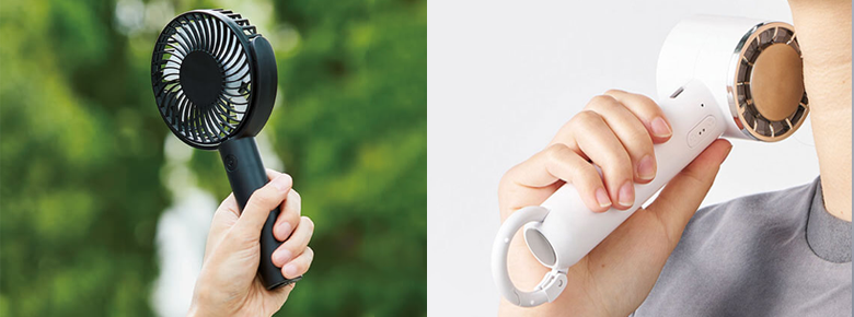 ハンディファンは携帯用の小型の扇風機。手に持って使ったり、首からかけられたり、卓上に置いて使えるタイプも。また冷却プレート付きのハンディファンはプレートを肌に直接当てることでクールダウン効果があるものも。暑い季節のノベルティとして大定番・大人気のアイテムです。電池式ハンディファンと充電式ハンディファンがあるので用途に合わせてお選びください。