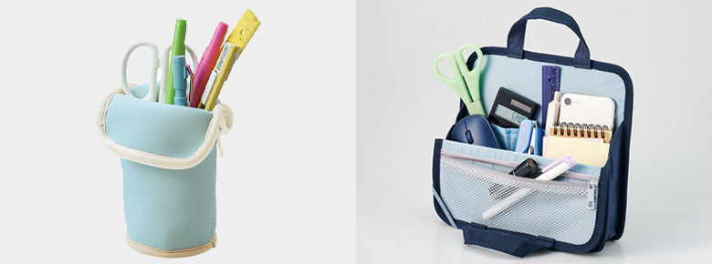 ペンや定規などの文具をまとめて収納できる文具ポーチ/ペンケース。持ち運びに特化したバッグタイプの文具ポーチや、自立してペンスタンドとしても使える文具ポーチも。学生さん向けノベルティの定番ですが、フリーアドレスオフィスの企業では社員向けノベルティとして選ばれることも多いです。