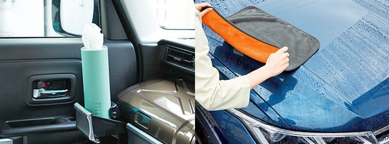 車のケアやドライブ中にあると便利なカー用品のご紹介。カーディーラーでのノベルティやファミリー層向けのノベルティで人気です。ボトルティッシュは車内のドリンクホルダーに入れて使えます。非常用トイレやハンマーやライトは、もしものときのために車に常備しておきたいアイテム。もらって嬉しいノベルティです。