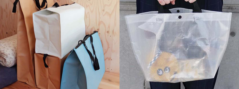レジャーシートでおなじみの素材でできたバッグです。量販店のショッパーやコインランドリーでもよく見かけますよね。軽くて丈夫、水濡れにも強いので、チームグッズなどスポーツ関連のノベルティでも人気です。もちろんショッパー的な使い方も主流。大きなサイズのものは荷物の整理に使うストレージバッグにもなるので収納アイテムにもおすすめです。