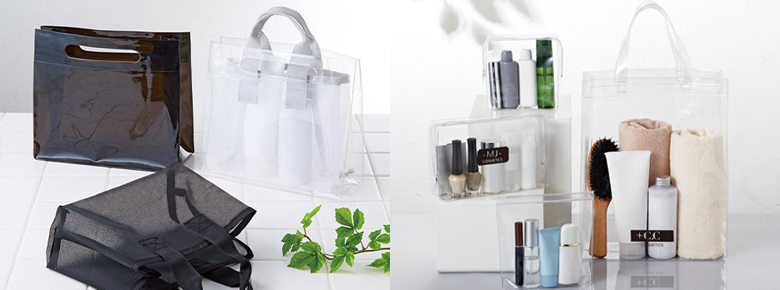 クリアバッグは透明・半透明で中が見えるクリア素材で作られたバッグ。ビニル素材(PVC)やPP素材などで素材の風合いが多少異なります。クリアバッグは水や汚れに強いので、サウナ・温泉・海・プールなど水に関するレジャーやスポーツ関連のノベルティに根強い人気があります。またスタッフバッグなどセキュリティの理由で中が見えるクリアバッグを採用するパターンも。