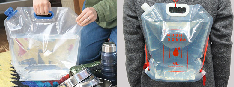 水を入れて運んだり保管ができる水バッグ/水タンク/給水袋。水バッグはキャンプなどのアウトドアレジャーのアイテムとして、また防災アイテムの「給水袋」としてよく使われています。使用前は非常にコンパクトなので、気軽に配布できるノベルティとしても人気。