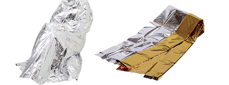 体温の低下を防ぐアルミブランケット/アルミシート。災害時にはブランケットや寝袋として寒さ対策にぜひ準備しておきたい防災グッズです。たたむとコンパクトになるので配布系ノベルティにもおすすめ。