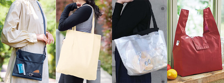 エコバッグ、コットンバッグ、ランチトート、サコッシュ、保冷バッグ、巾着…などなど、素材もサイズもタイプも多種多様。コンパクトに持ち歩きたいなら折りたたみバッグ。イベントなどでアクティブに使ってもらうならサコッシュ。展示会や説明会などで資料配布に使うなら不織布バッグや薄手のコットンバッグ。用途に合わせてお選びください。