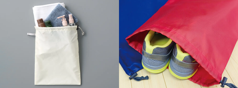 ポリ巾着/ナイロン巾着は主にポリエステル素材・ナイロン素材でつくられた巾着。薄手で軽くて耐久性があり、スポーツやアウトドア関連のノベルティによく選ばれています。シューズケースとしてもおなじみです。