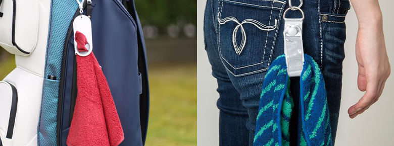 タオルをひっかけて持ち歩くことができるタオルホルダー。タオルをすぐに使える状態にしておけるので便利です。スポーツや登山などのアウトドアレジャーや、イベントなどで人気のアイテム。子供向けノベルティにもおすすめです。