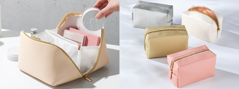 化粧品やメイクアイテムを収納するコスメポーチ。サイズによって持ち歩き用のポーチ、自宅での整理収納用のポーチと用途が分かれます。外出先でも使いやすい自立型のポーチも人気。クッション性の高いものはコスメ以外にも収納アイテムとして使えるので、コスメ関連のノベルティ以外にも幅広く選ばれています。